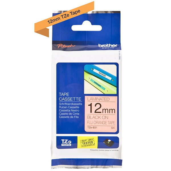 BROTHER TZE-B31 LAMINATED LABELLING TAPE 12MM BLACK ON FLUORO ORANGE