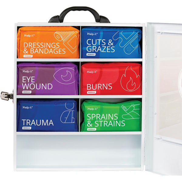 The Help-It Modular Hub First Aid Station features six color-coded, injury-specific modules securely housed in a durable wall-mounted cabinet with a clear Perspex front