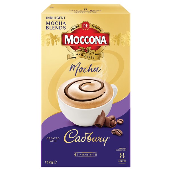 The perfect blend of Moccona coffee combined with Cadbury cocoa, that delivers a creamy indulgent mocha experience, finished with a layer of velvety froth.
