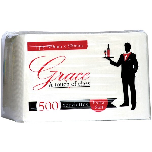 Grace white serviettes are a great quality, single ply, 500 pack, extra soft napkin ideal for cafes, restaurants or just for a touch of class on a picnic.