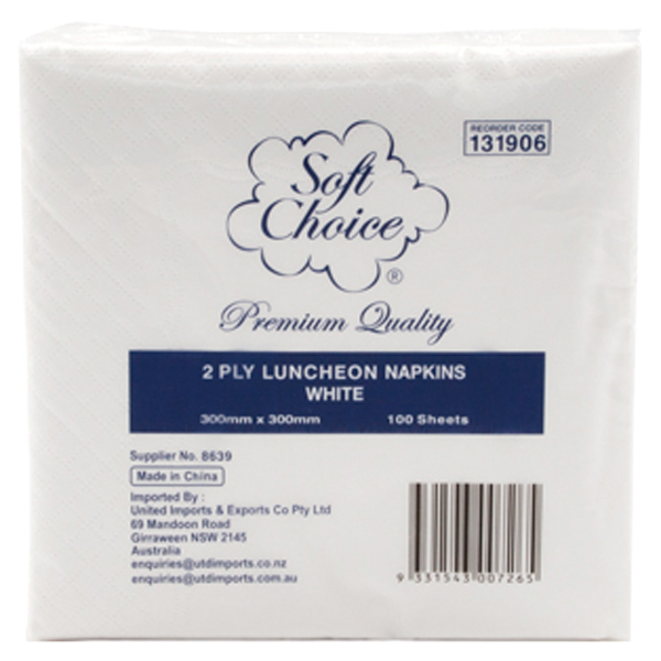 SOFT CHOICE LUNCHEON SERVIETTE 2 PLY 4 FOLD WHITE PACK 100